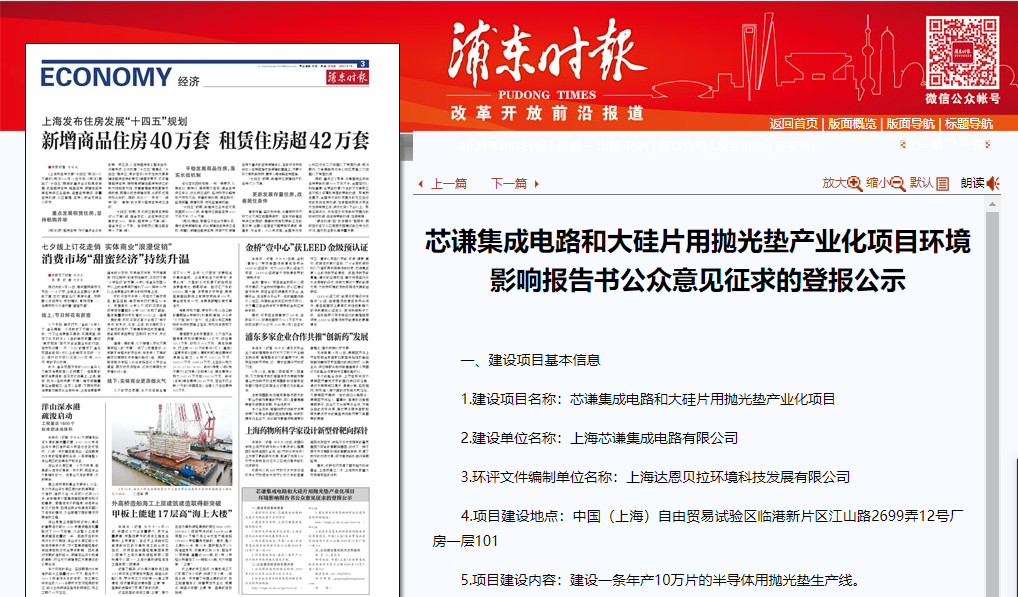 8月16日,浦東時報刊登了芯謙集成電路和大硅片用拋光墊產業化項目環境影響報告書公眾意見征求的登報公示。