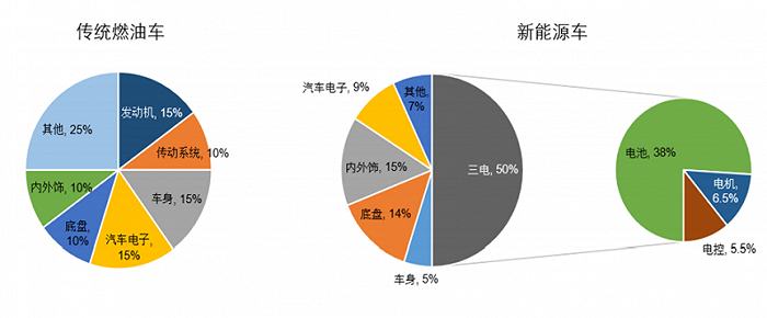 根據高工機器人數據,在燃油車成本構成中,發動機、車身與汽車電子占比最高,均為15%,底盤、傳動系統分別占比10%;而在電動車中,“三電”系統占比高達50%,其中電池占比最高,為38%,電機占比6.5%,電控占比5.5%。