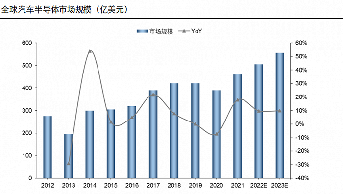根據Gartner 和Statista數據,2012年以來,全球汽車半導體規模整體呈上升趨勢,2020年受疫情影響僅有390億美元,受益新能源車滲透率提升,預計到 2023年,全球汽車半導體市場規模將達到555億美元。