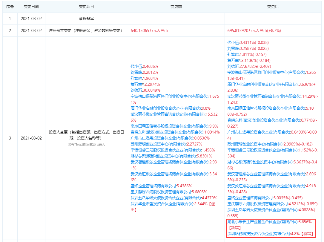 企查查資料顯示,8月2日,武漢市聚芯微電子有限責任公司(以下簡稱“聚芯微電子”)發生工商變更,新增投資人深圳哈勃科技投資合伙企業(有限合伙)、湖北小米長江產業基金合伙企業(有限合伙),而兩者分別為華為、小米旗下投資平臺;同時,聚芯微電子注冊資本由640.15萬元人民幣變更為695.82萬元人民幣,增幅8.7%。