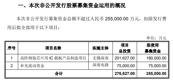 昨日(8月2日),深南電路發布2021年度非公開發行A股股票預案,擬募集資金不超過25.50億元,其中18.00億元用于高階倒裝芯片用IC載板產品制造項目、7.50億元用于補充流動資金。