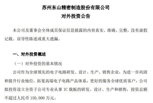7月28日,A股上市公司蘇州東山精密制造股份有限公司(以下簡稱“東山精密”)發布公告,擬投資設立全資子公司專業從事IC載板的研發、設計、生產和銷售,投資總額不超過人民幣15.00億元。