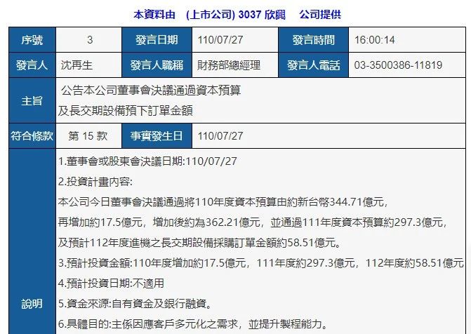 7月28日,欣興電子財務部總經理沈再生在法說會上表示,從2019年到2023年,預計總共投入資本支出將高達新臺幣千億元,其中85%以上用來擴充IC載板產能。其中,欣興今年資本支出最高,歷經四度上調后,欣興今年資本支出已至新臺幣362.21億元。