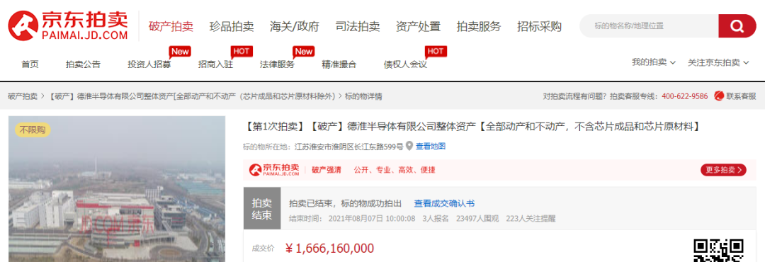 根據該平臺的競買公告,德淮半導體有限公司破產管理人于2021年8月6日10時至2021年8月7日10時止在京東拍賣破產強清平臺進行公開拍賣活動,拍賣標的為德淮半導體有限公司整體資產【包括德淮半導體有限公司住所地現有全部動產和不動產(芯片成品和芯片原材料除外)】,標的物所在地位于江蘇淮安市淮陰區長江東路599號,評估價為23.80億元,起拍價為16.66億元。
