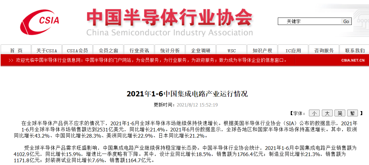 8月13日,中國半導體行業協會官網發布了2021年1-6月中國集成電路產業的運行情況。