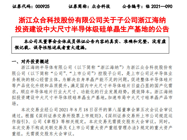 8月19日,浙江眾合科技股份有限公司(以下簡稱“眾合科技”)發布公告稱,公司旗下控股子公司浙江海納半導體有限公司(以下簡稱“浙江海納”)擬投資不超過5.20億元建設國產半導體級中大尺寸單晶基地項目,加速布局中大尺寸硅單晶產品市場。