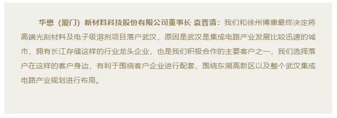 公眾號“招商武漢”發文指出,華懋(廈門)新材料科技股份有限公司董事長袁晉清表示,我們和徐州博康最終決定將高端光刻材料及電子級溶劑項目落戶武漢,原因是武漢是集成電路產業發展比較迅速的城市,擁有長江存儲這樣的行業龍頭企業,也是我們積極合作的主要客戶之一,我們選擇落戶在這樣的客戶身邊,有利于圍繞客戶企業進行配套,圍繞東湖高新區以及整個武漢集成電路產業規劃進行布局。
