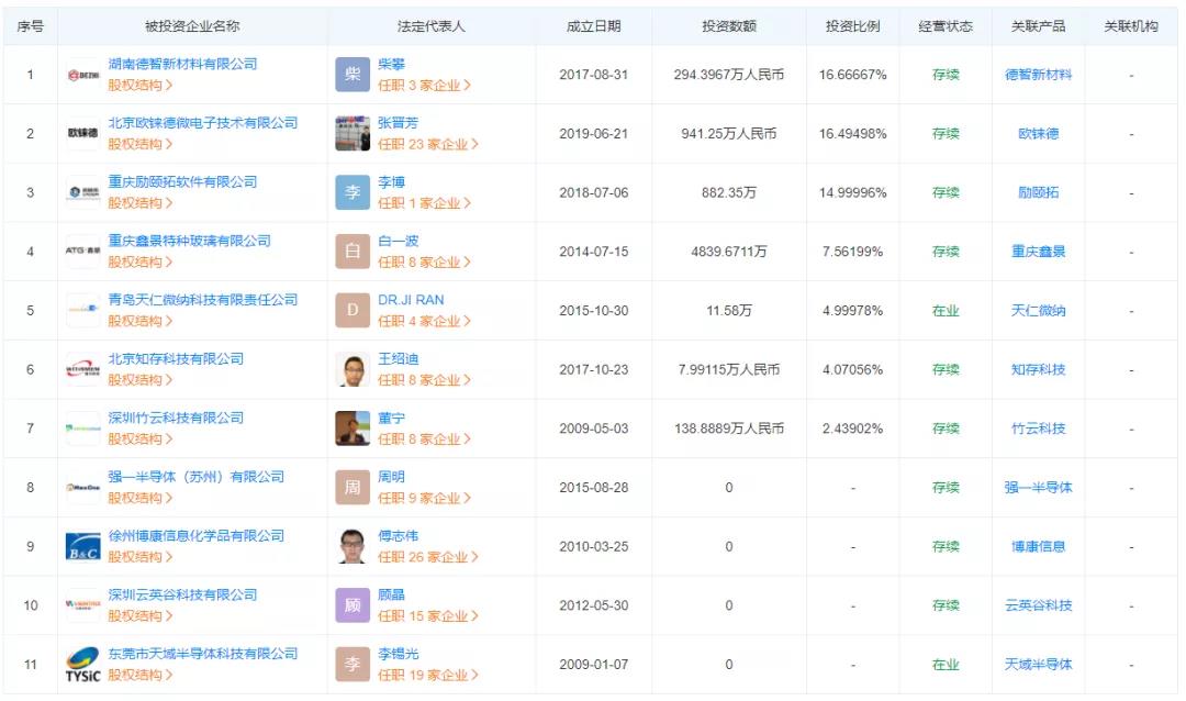 據天眼查新消息,截至9月15日,其在短短5個月時間對外投資企業已達11家,換句話而言,平均每個月投資2家企業。其中包括顯示驅動芯片廠商歐錸德微電子、云英谷,半導體光刻機材料廠商徐州博康,第三代半導體碳化硅廠商天域半導體等。