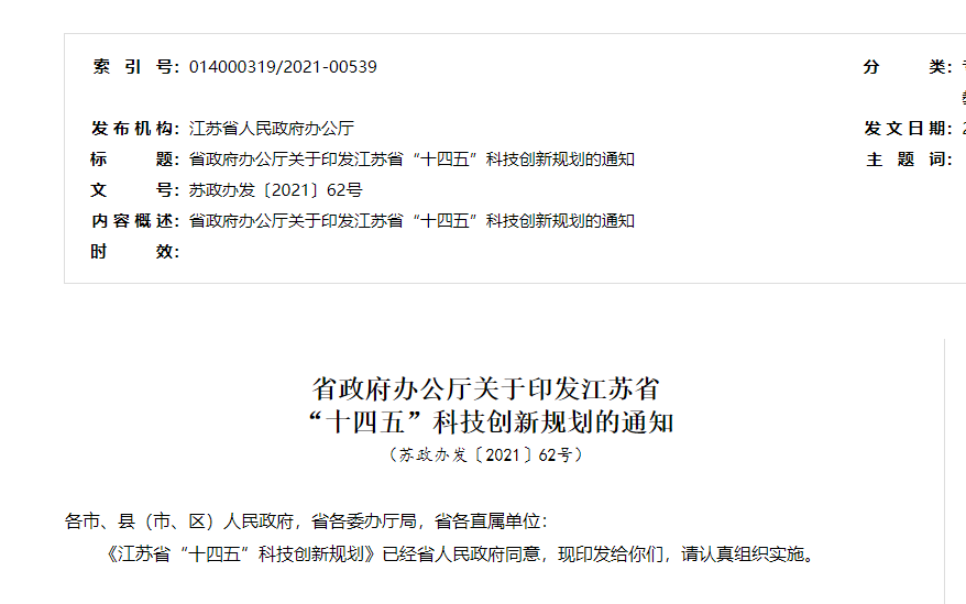 近日,江蘇省府辦公廳發(fā)布關(guān)于印發(fā)《江蘇省“十四五”科技創(chuàng)新規(guī)劃》(以下簡(jiǎn)稱(chēng)“《規(guī)劃》”)的通知。
