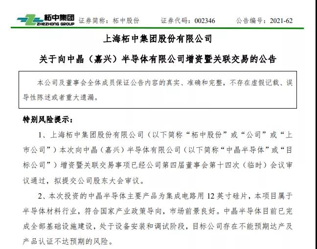 9月27日,上海柘中集團股份有限公司(以下簡稱“柘中股份”)發布公告稱,擬向中晶(嘉興)半導體有限公司(以下簡稱“中晶半導體”)進行增資。
