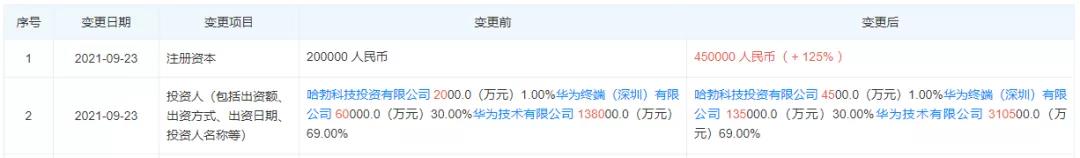 其中華為技術有限公司對其的出資額由13.8億元增至31.05億元,華為終端(深圳)有限公司對其的出資額由6億元增至13.5億元,而哈勃科技投資有限公司對其的出資額由2000萬元增至4500萬元。