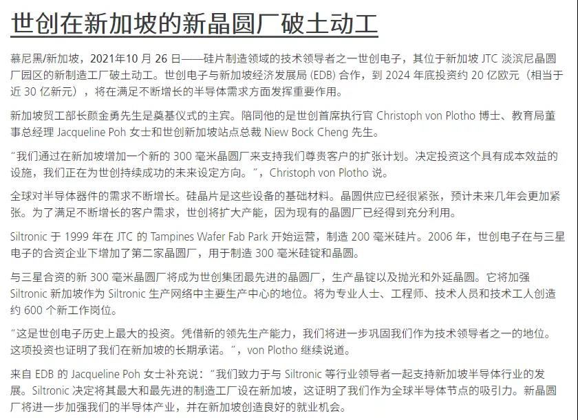 10月26日,德國(guó)晶圓制造商世創(chuàng)電子(Siltronic)宣布,其位于新加坡JTC淡濱尼晶圓廠園區(qū)的300mm(12英寸)制造工廠破土動(dòng)工,預(yù)計(jì)到2024年底投資約20億歐元(約合人民幣148.06億元)。